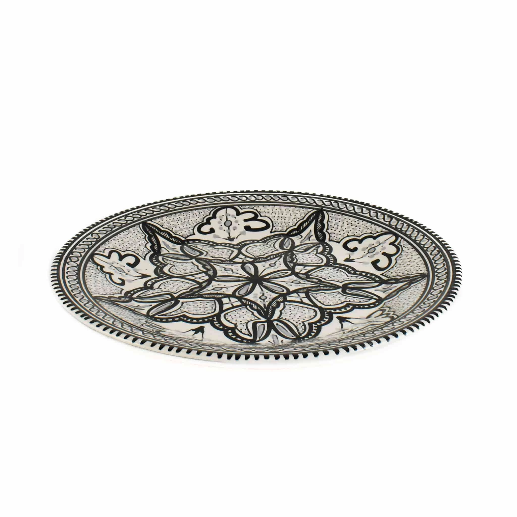 Use the alyasamin patterned dinner plate to serve your mezze feast in traditional Tunisian style. Each large dinner plate is decorated with sweeping patterns in deep shades of grey and black, making it a statement piece for your table. Fill your plate with spiced couscous and fragrant tagines, or pile it high with pieces of syrup-soaked almond baklava and let everyone help themselves.Â