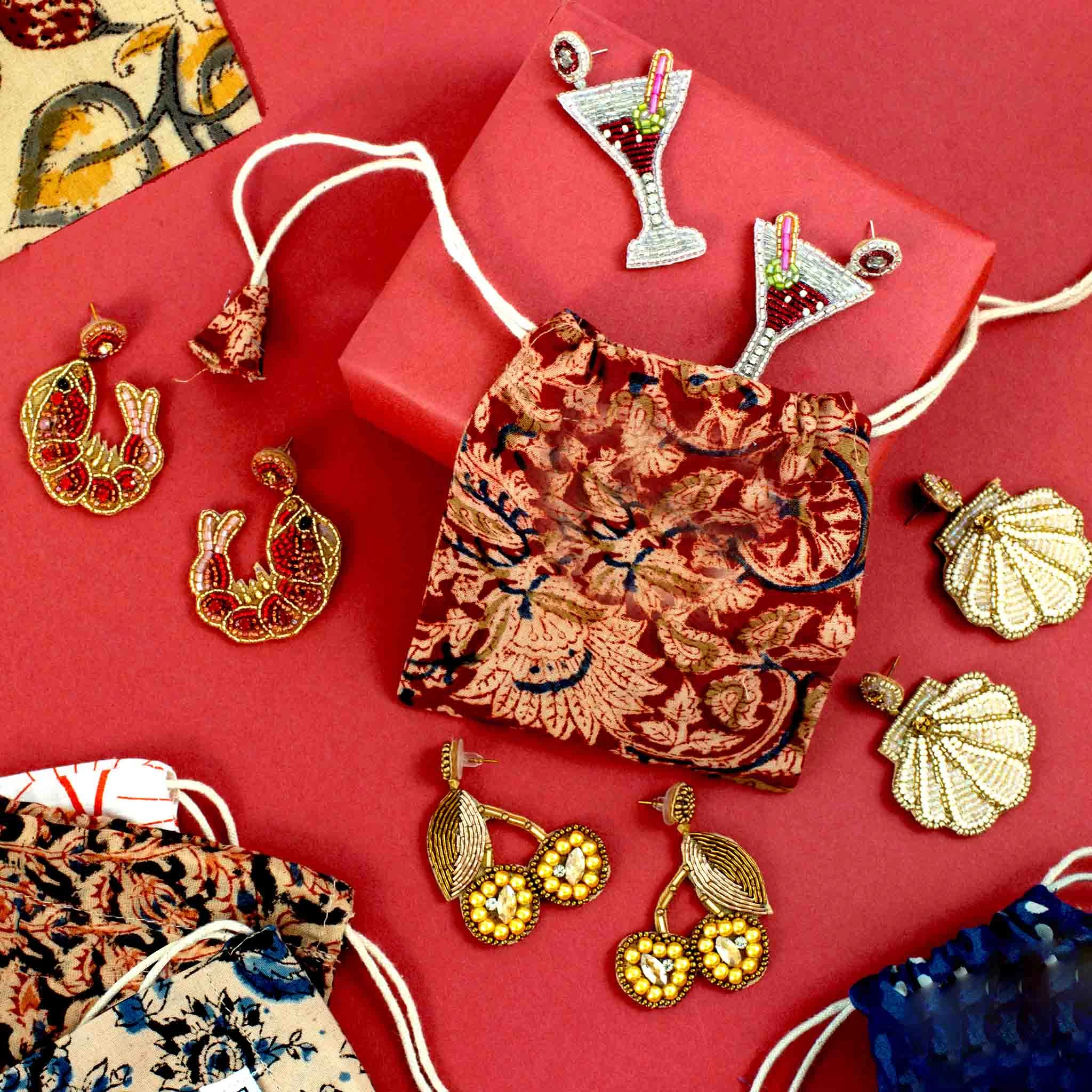- Each pair of earrings comes in a unique fabric pouch.Â