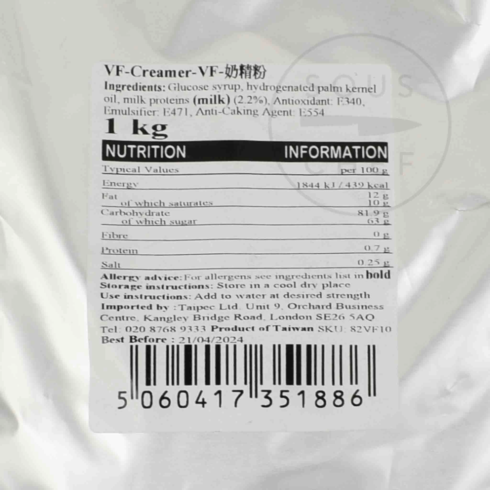 Ingredients: Tapioca syrup, partially hydrogenated palm kernel oil, sodium caseinate (milk)(2.2%), antioxidant: E340, emulsifier: E471, anti-caking agent: E554