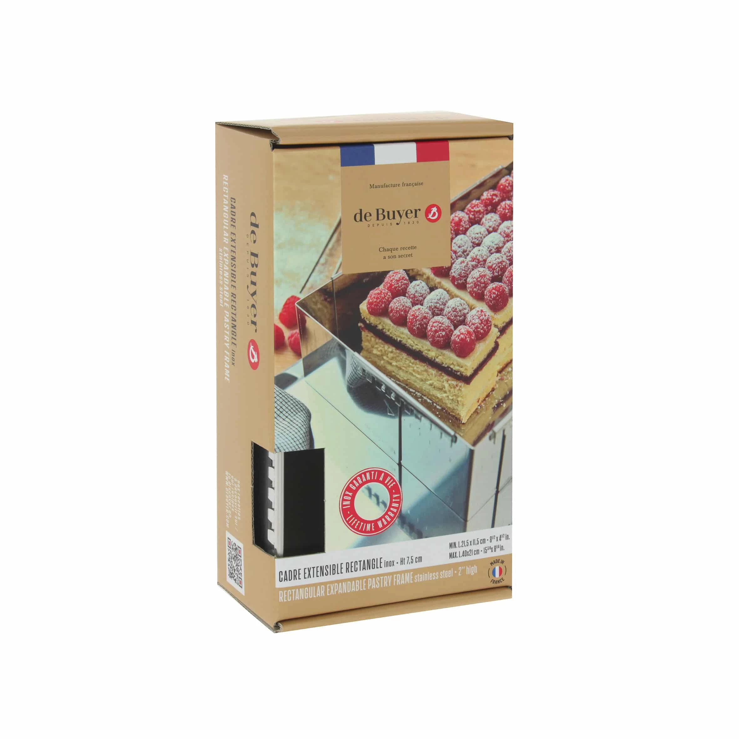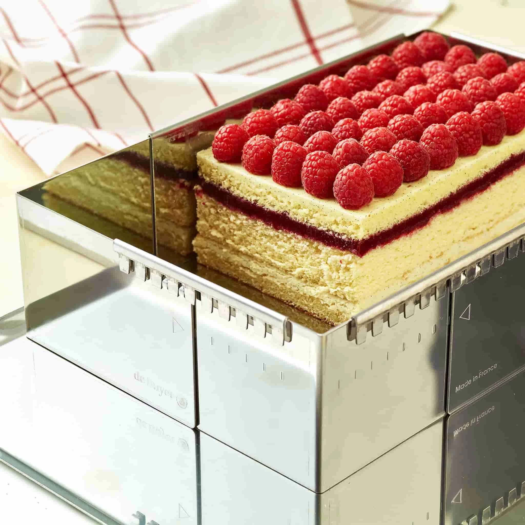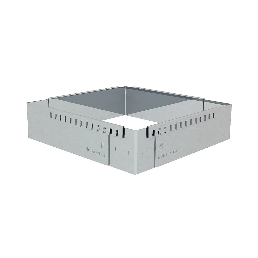 The De Buyer extendable stainless-steel rectangle is just what patissiers and bakers need for pristine opera cakes or entremets in any size from 21.5 x 11.5cm up to 40 x 21cm. So there’s no need for a teetering pile of different sized frames filling up your cupboards.