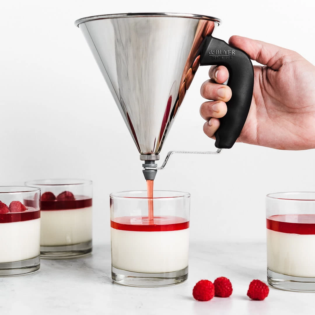 You can also use the mini piston funnel to fill moulds for freezing, or even to decorate cakes with a smooth stream of mirror glaze.