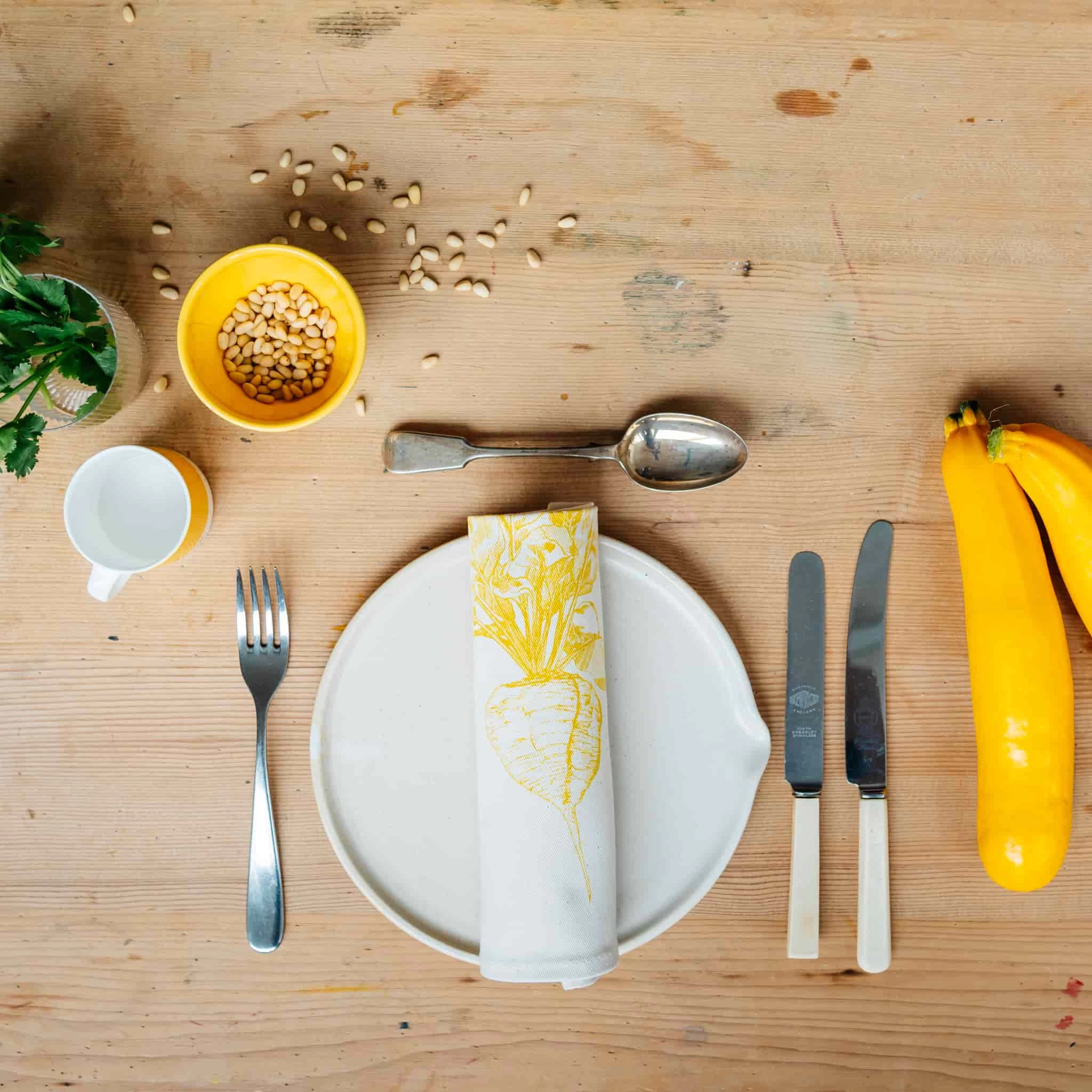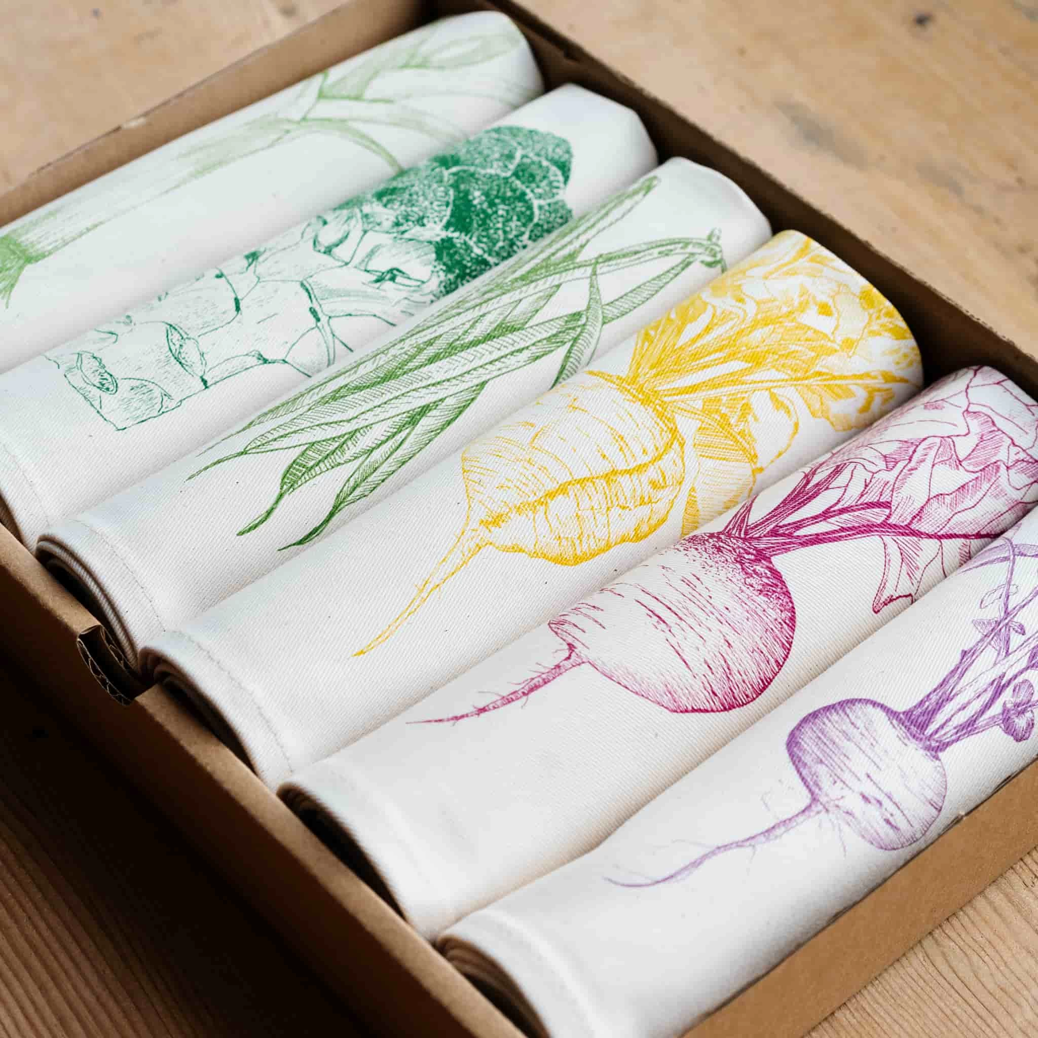 These garden veg mixed-design napkins bring a rustic and comforting feel to any table. These hand-printed napkins are illustrated with a different colour garden vegetables including swede, leeks and broccoli. Designer Lottie Day took inspiration through memories of her father’s Norfolk allotment. These designs embody authentic countryside living and the joy of a kitchen garden.