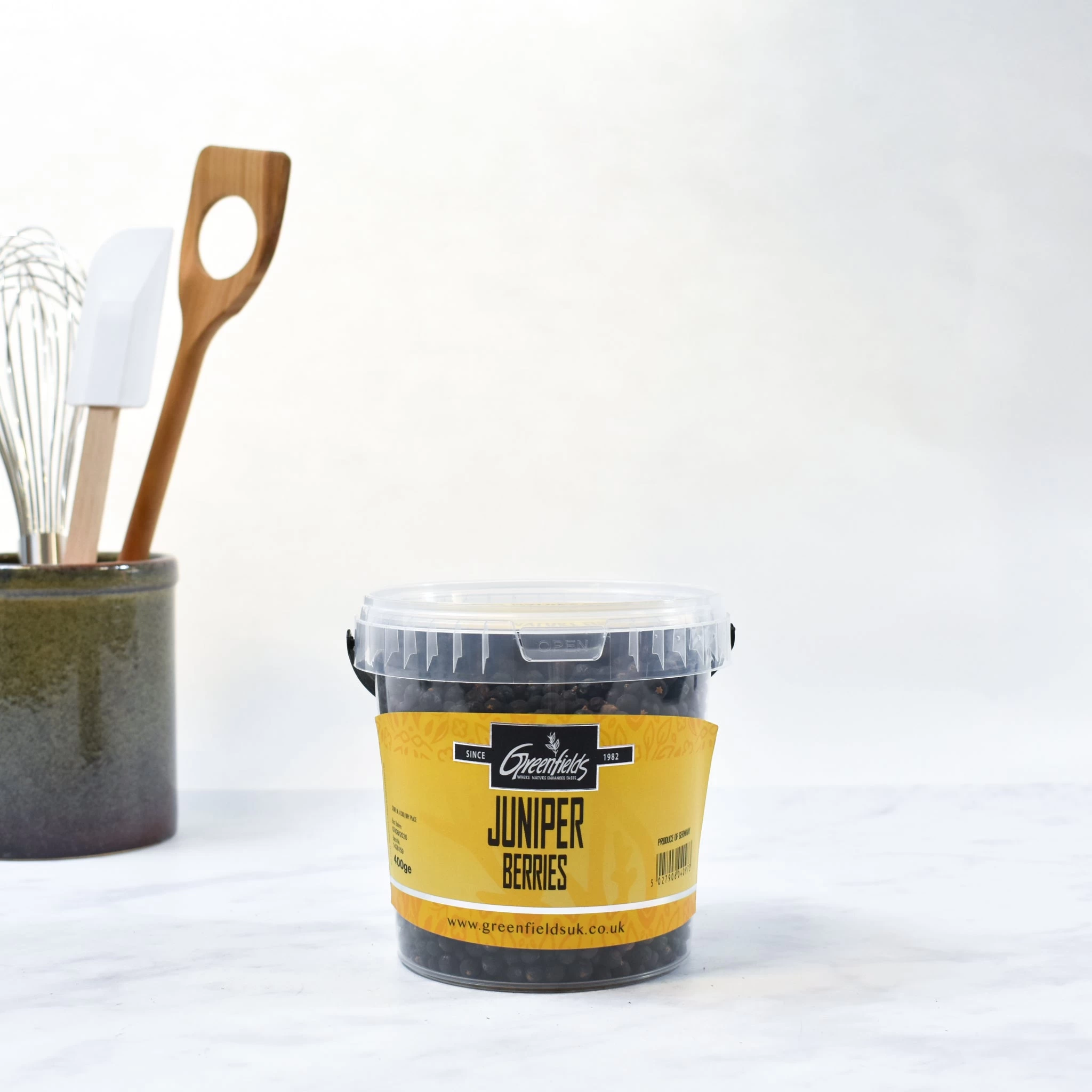 Juniper berries from Greenfields, a second generation UK-based family business. Greenfields’ herbs and spices are used by restaurants, artisans and street food producers across the country – all who enjoy their great value, kitchen-safe and easy-to-use resealable plastic tubs for their ingredients. Their philosophy is to provide good quality products at a great price.