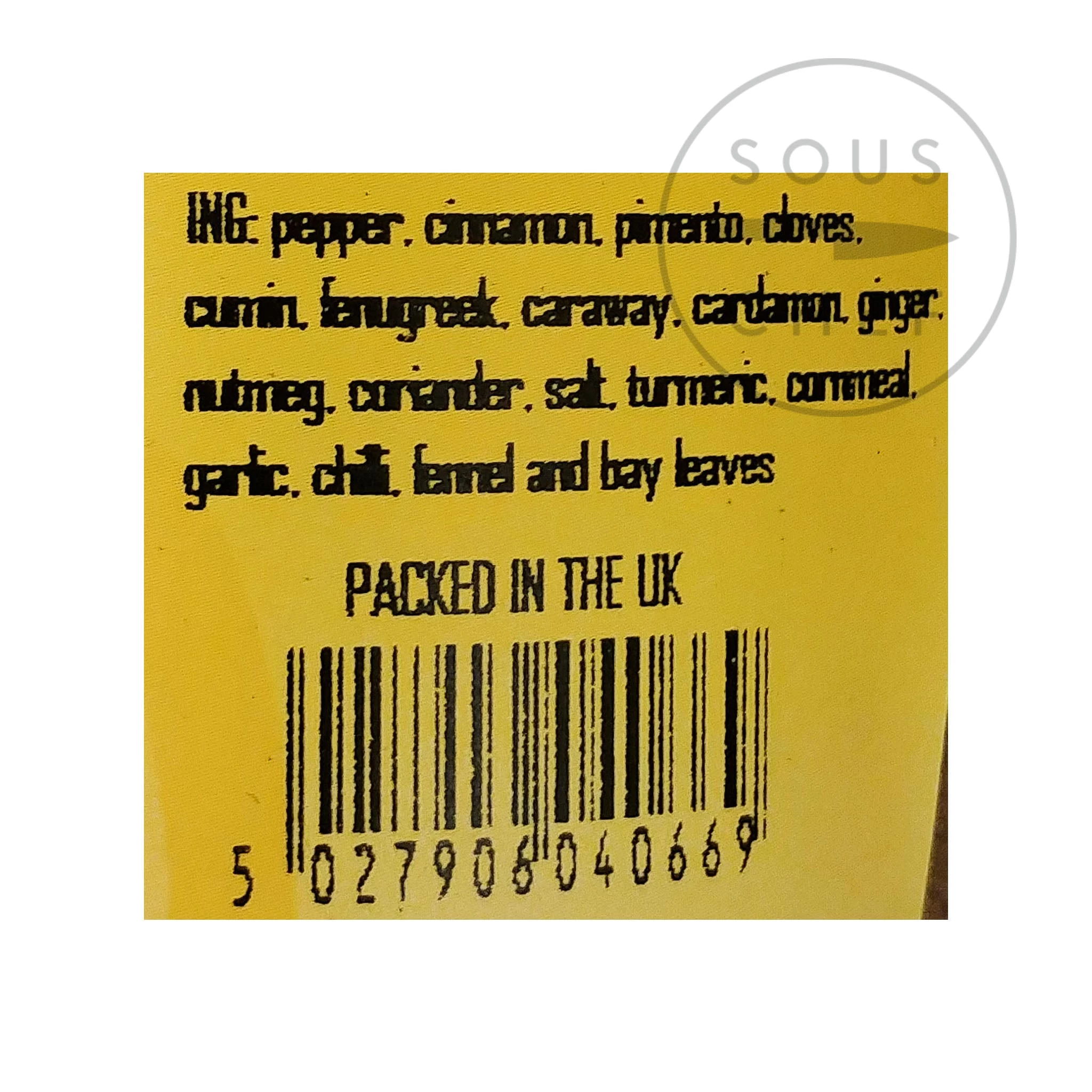 Ingredients: pepper, cinnamon, pimento, cloves, cumin, fenugreek, caraway, cardamom, ginger, nutmeg, coriander, salt, turmeric, cornmeal, garlic, chilli, fennel, bay leaves.
