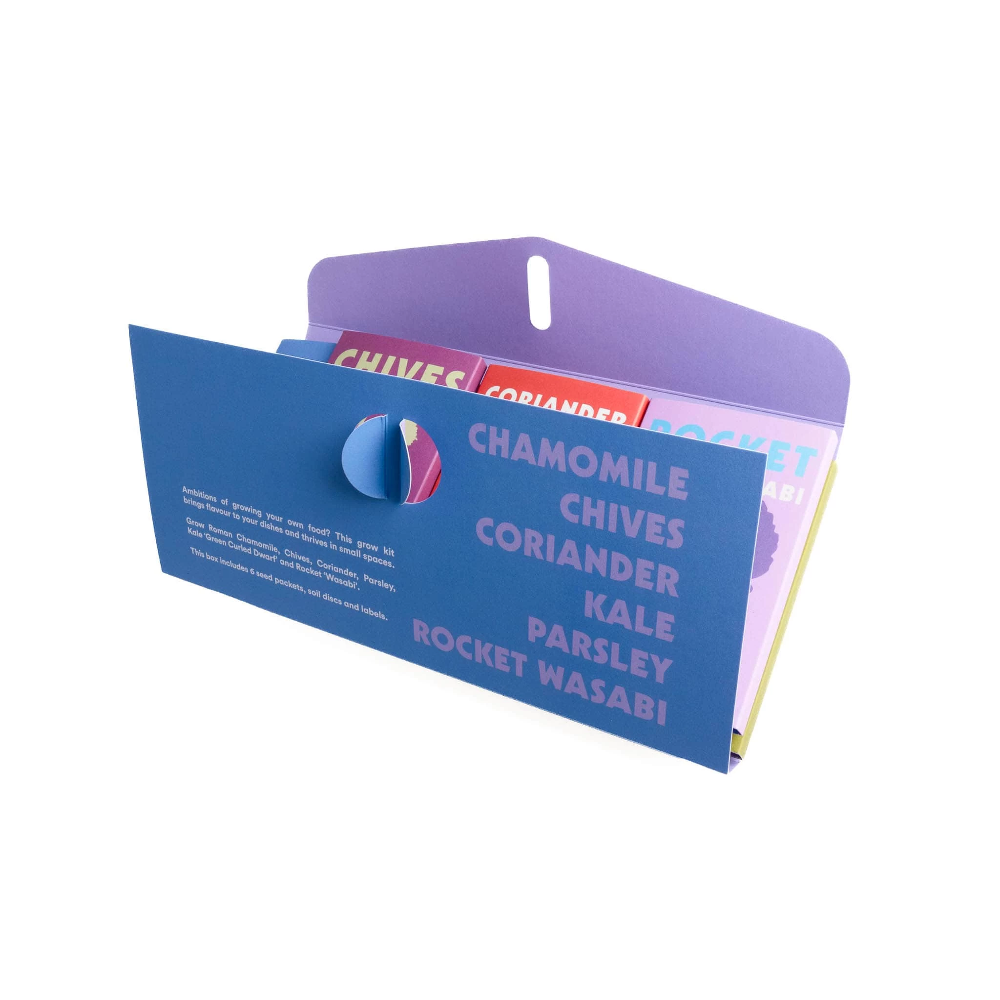 The kit includes 6 seed packets with peat-free soil discs and plant labels. You will grow: