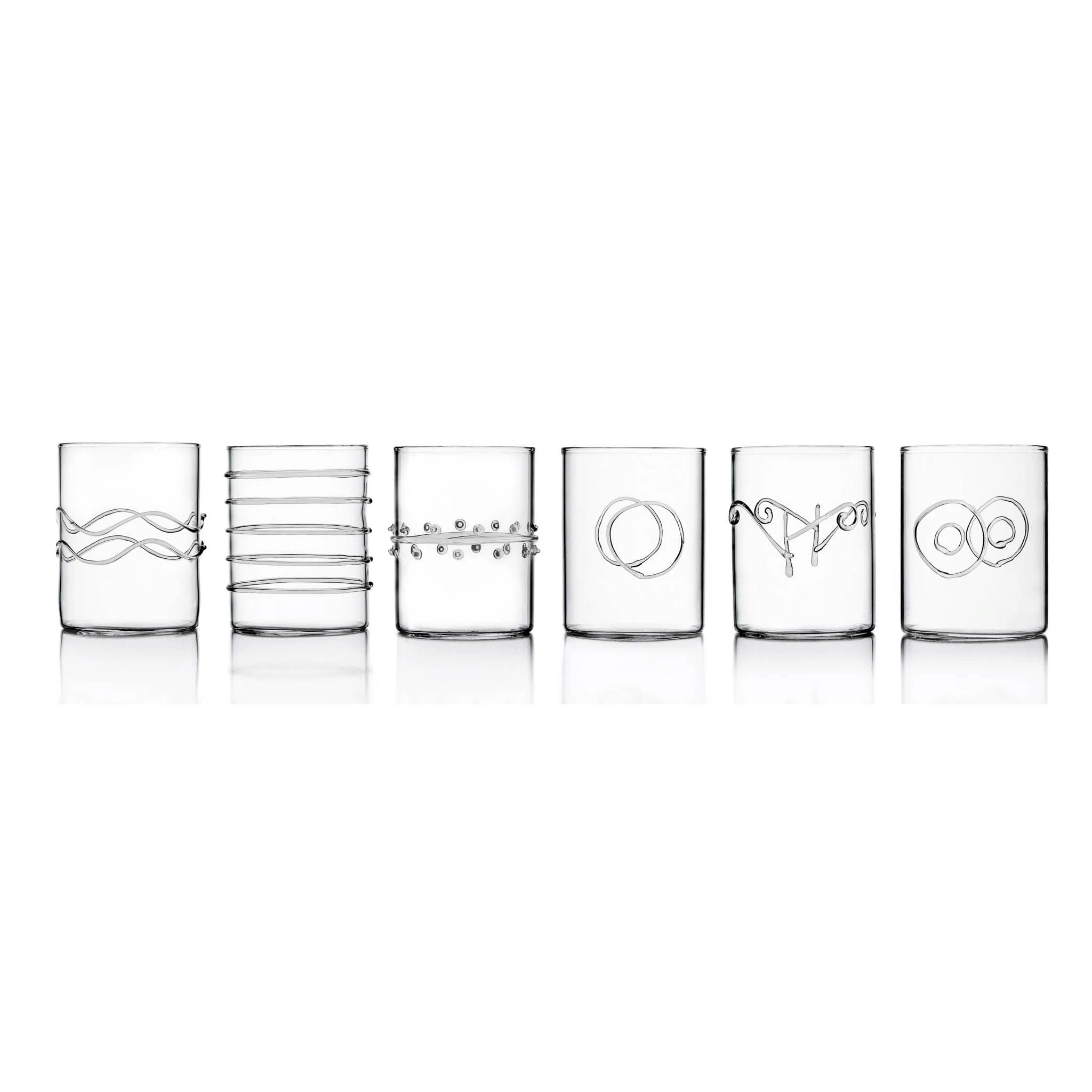 These Ichendorf Milano water tumblers are a stylish addition to your glassware collection. Each glass has a unique abstract design, from lines and dots to circles and swirls. Made in Italy, they are designed for water but also elegant enough for cocktails – a Negroni, perhaps?