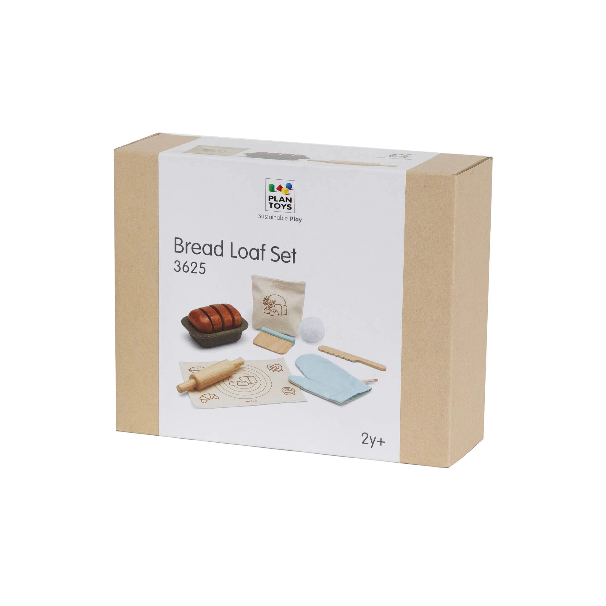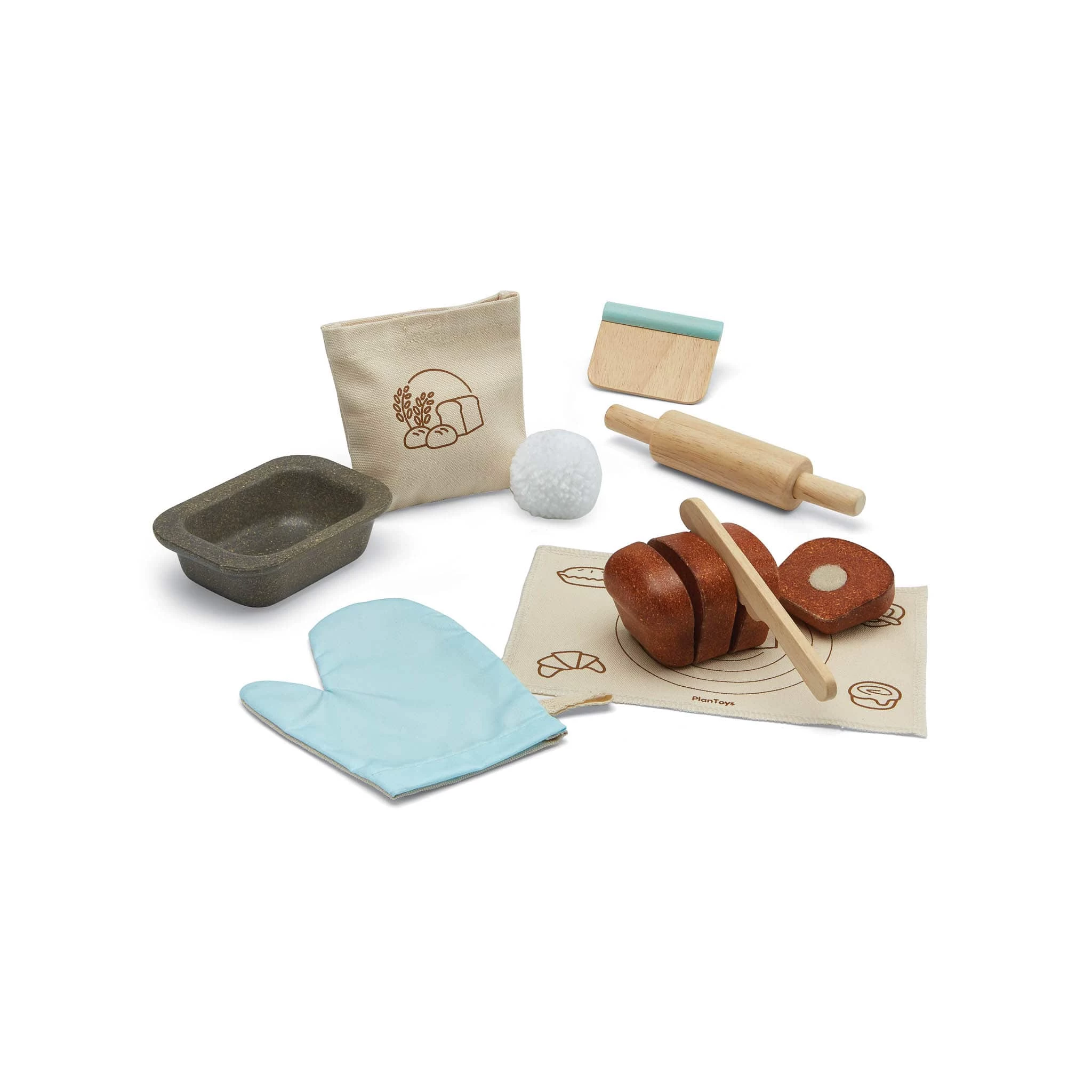This wooden bread loaf play set for children is an imaginative addition to every game collection. This set includes a baking tray, rolling pin, loaf of bread, bread knife and washable oven mitt, plus a make-believe bag of flour. Teach little ones how to use the tools and encourage future bakers with this sweet play set.