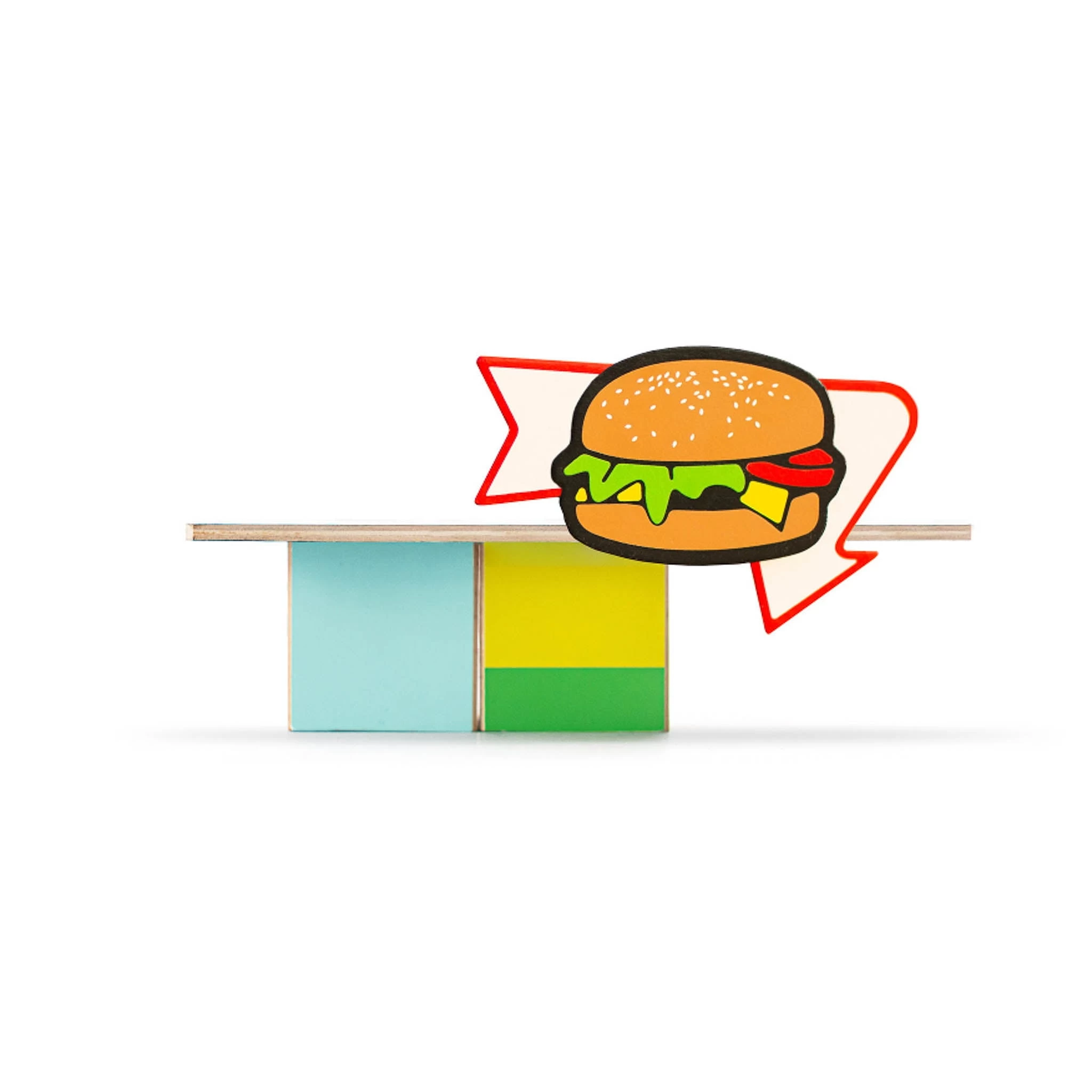 This kids wooden hamburger stand toy lets you serve your own hamburgers in your own shack! Made from sturdy beech wood, this vibrant toy has everything you need to assemble your own burger stand, with colourful and fun signs so your customers know where to stop! Add this vibrant truck to your toy collection to make play time even more exciting.