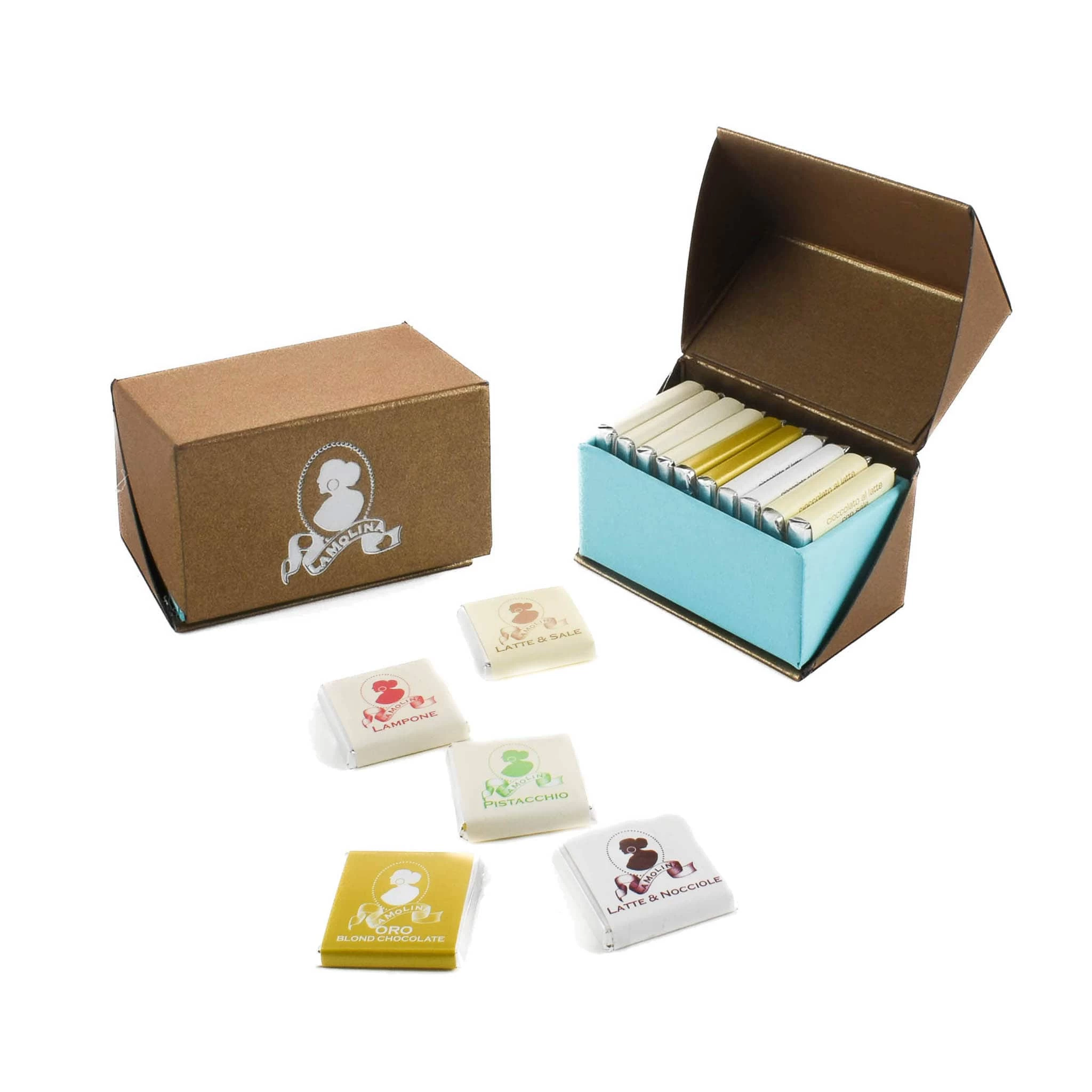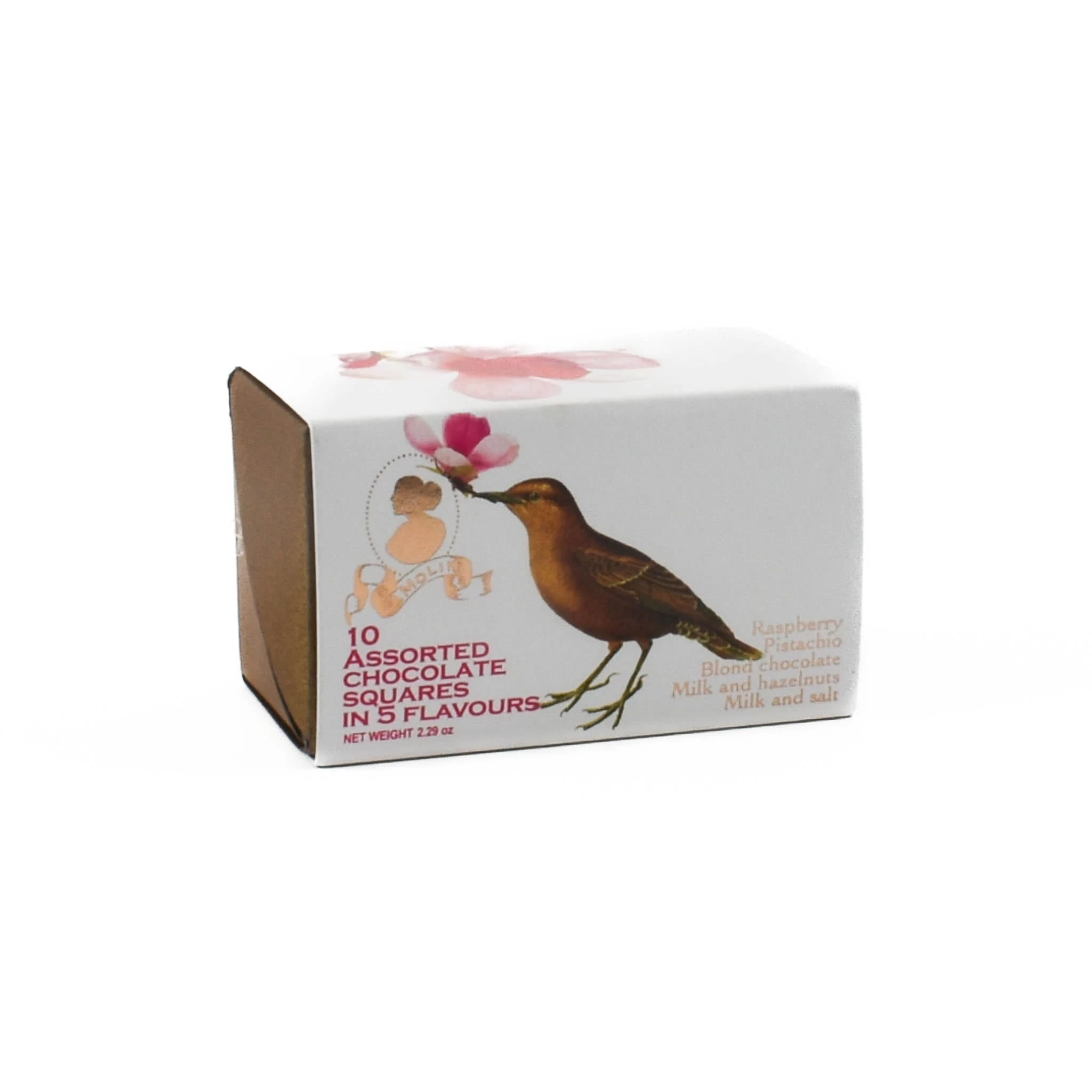 Each chocolate tablet is individually wrapped, then packaged in a colourful, flower-adorned sleeve. Gift this box of Italian chocolates, or serve them as petit fours.