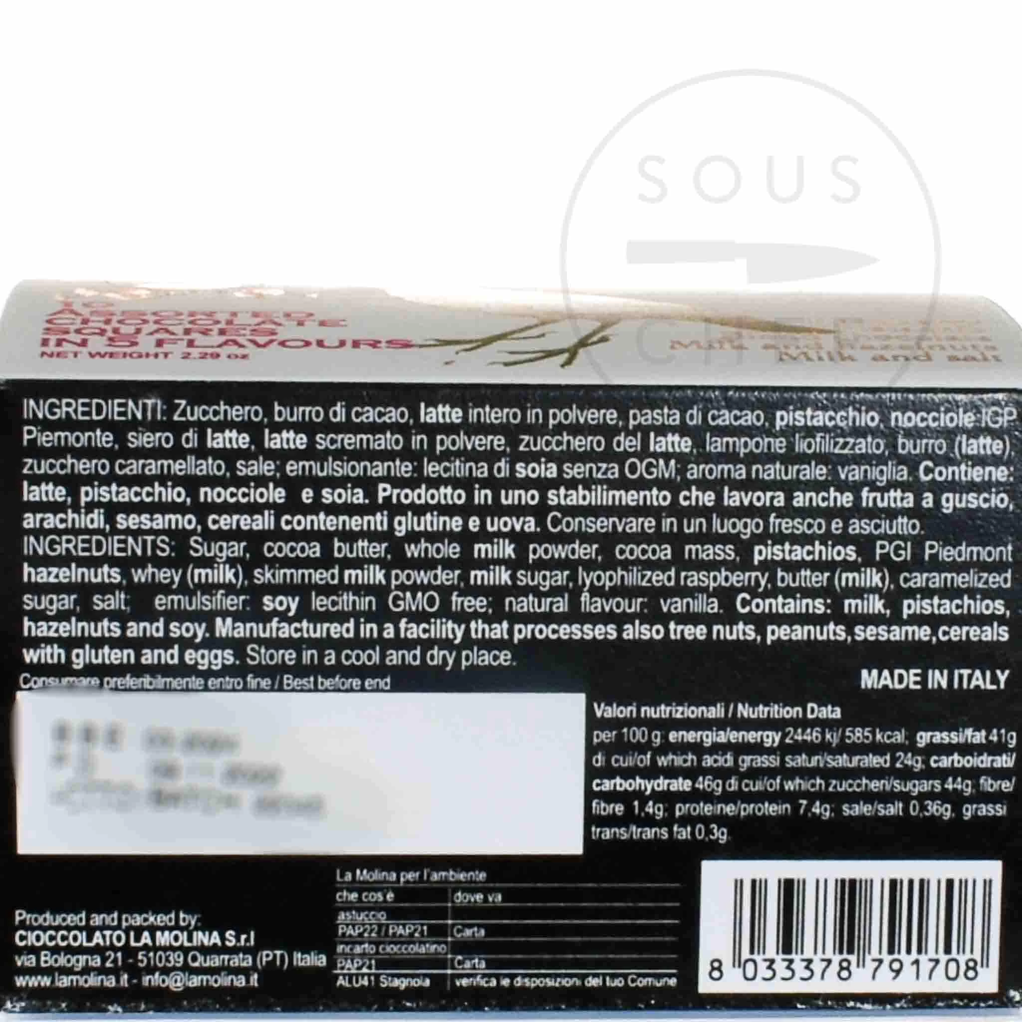 Ingredients: Sugar, cocoa butter, whole milk powder, cocoa mass, pistachios, PGI Piedmont hazelnuts 1,8%, whey (milk),skimmed milk powder, milk sugar, lyophilized raspberry, butter (milk), caramelised sugar, salt; emulsifier: soy lecithin GMO free; natural flavour: vanilla.