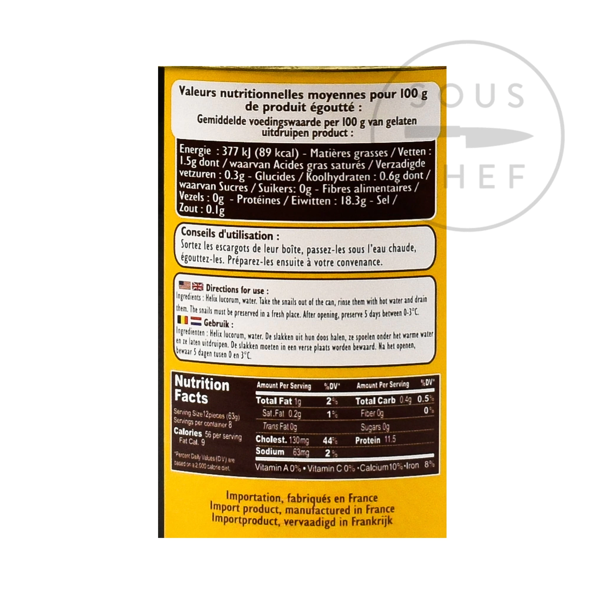 Snails are considered something of a French delicacy – often referred to as ‘escargot’, and frequently cooked with butter, finely-chopped shallots, garlic, parsley, salt and pepper. This extra large tin of French snails is ideal for a dinner party or for caterers.