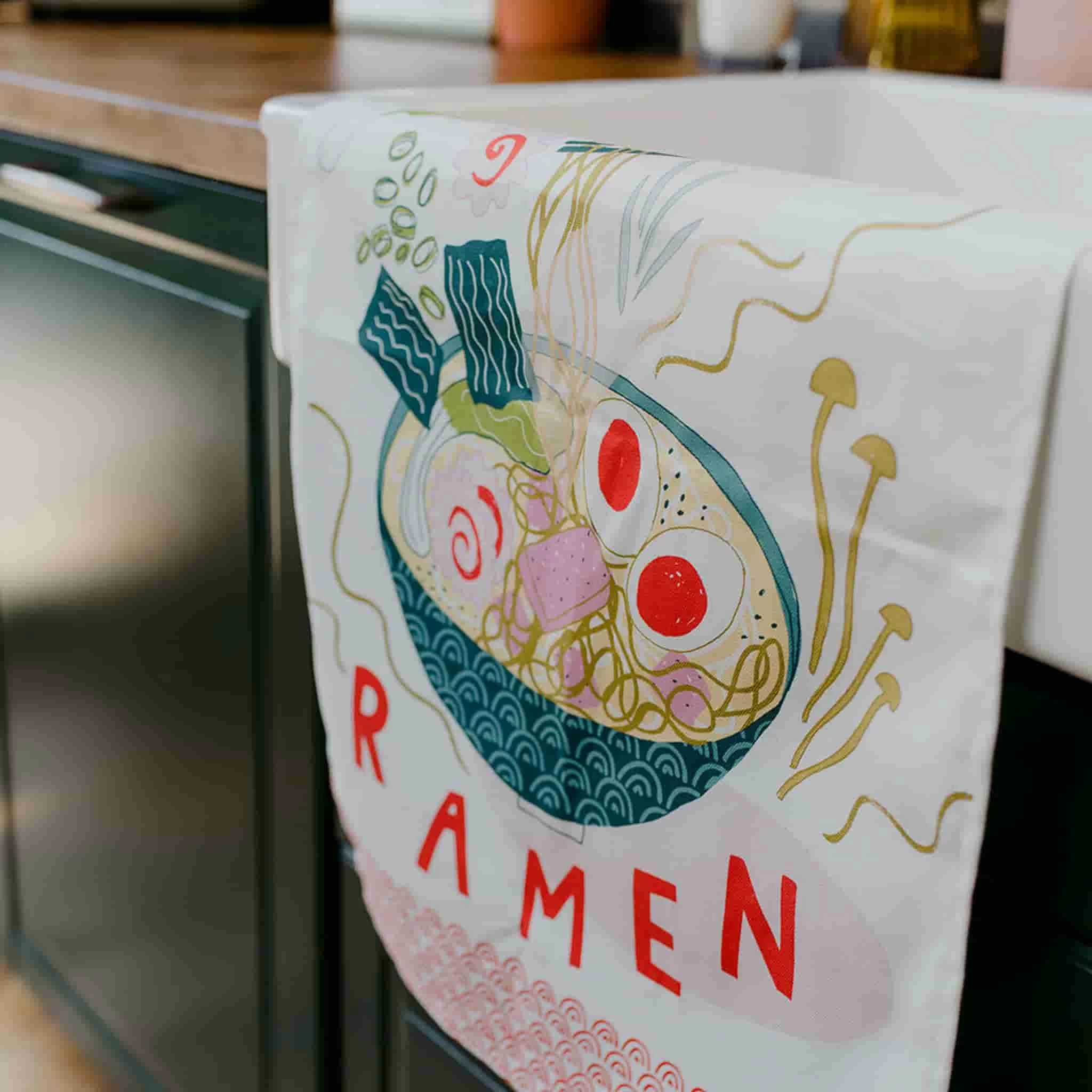 Express your love for Asian food with this beautiful ramen tea towel. Designed by London-based illustrator Laura Barnes, the white cotton towel showcases a huge bowl of steaming ramen topped with seaweed, soft-boiled eggs and narutomaki (steamed fish cake). Surrounding the teal bowl are a scattering of spring onions, slender enoki mushrooms and the word ‘ramen’ in vibrant red.
