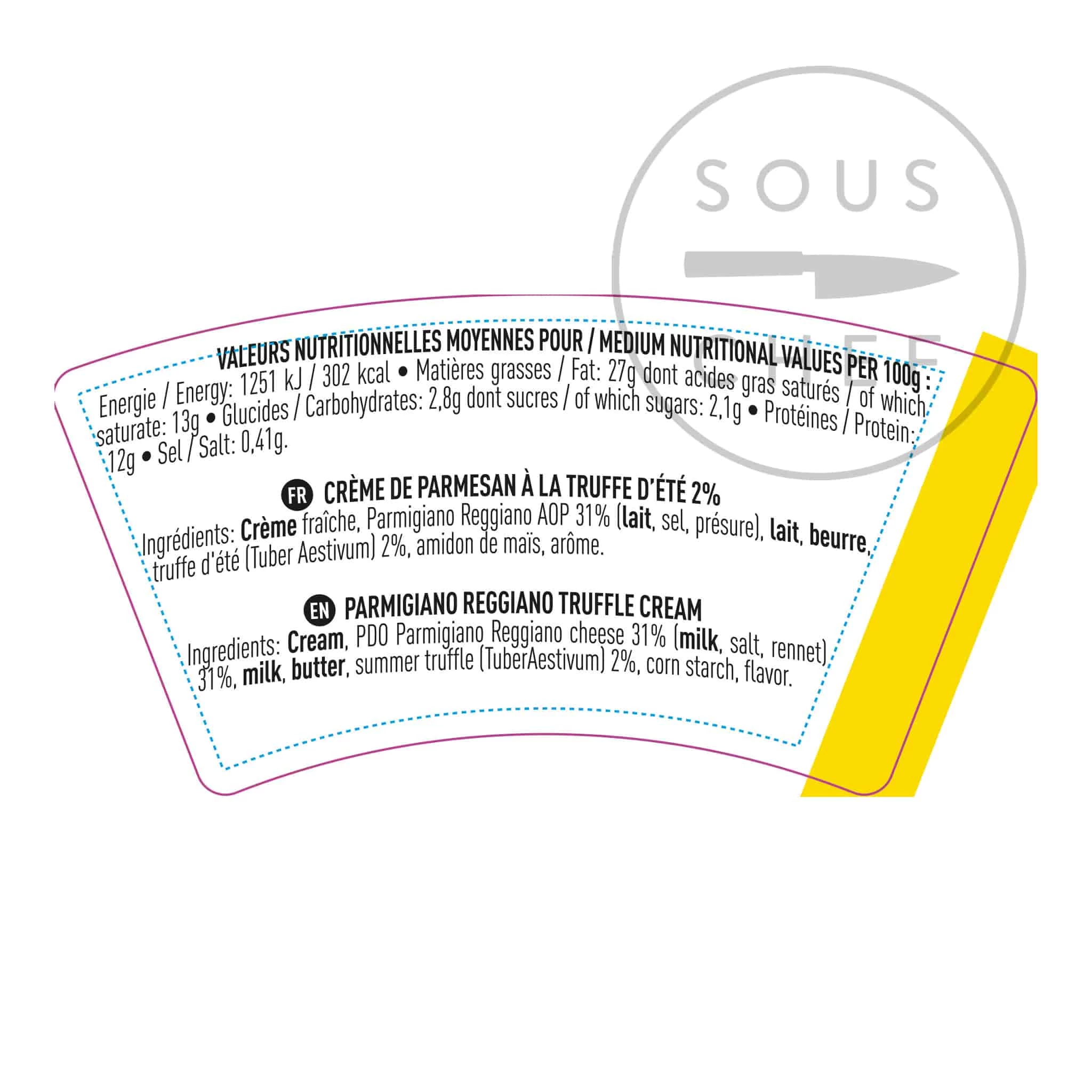 Ingredients: Cream, PDO Parmigiano Reggiano cheese 31%, (milk, salt, rennet), 31%, milk, butter, summer truffle ( tuber aestivum) 2%, corn starch, flavour.
