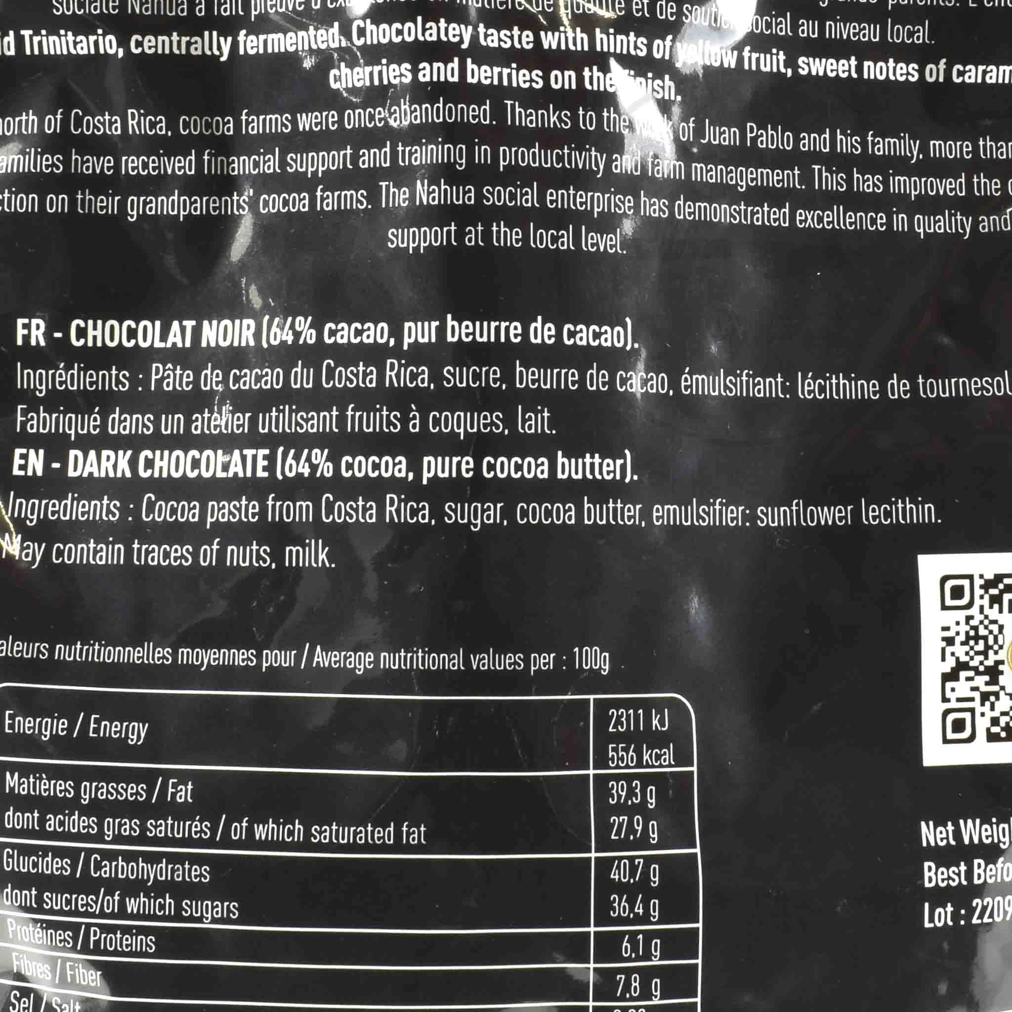 Ingredients: Cocoa paste from Costa Rica, cane sugar, cocoa butter, emulsifier: sunflower lecithin.Â