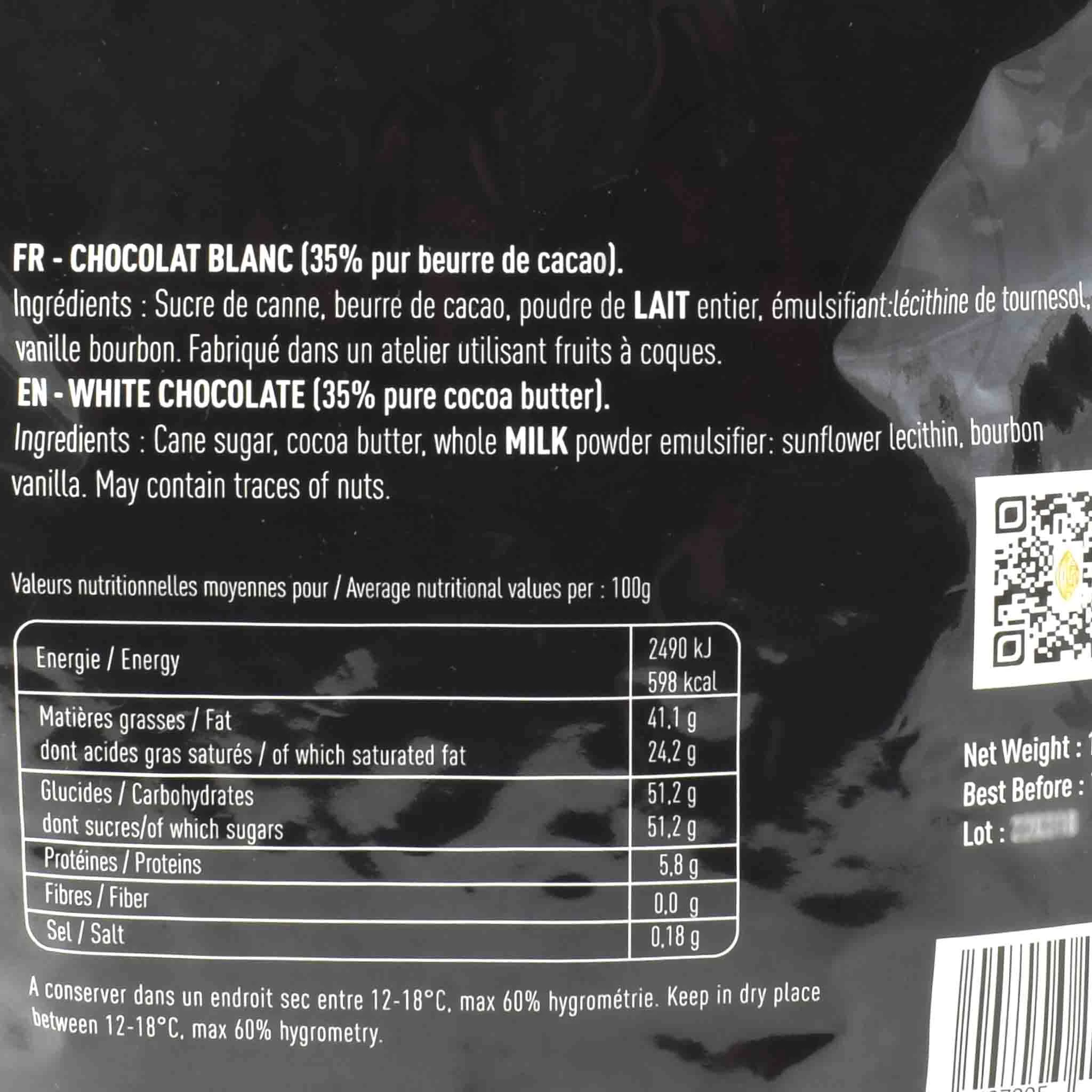 Ingredients: Cane sugar, cocoa butter, whole milk powder, emulsifier: sunflower lecithin, bourbon vanilla.