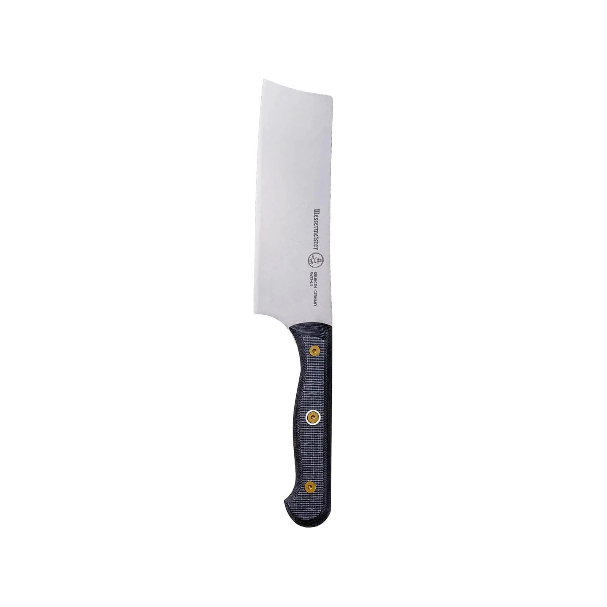 Messermeister’s custom chef nakiri knife makes light work of chopping hard vegetables. With a thin blade and straight cutting edge, this cleaver-like blade is excellent for slicing and shredding cabbages, onions and potatoes.