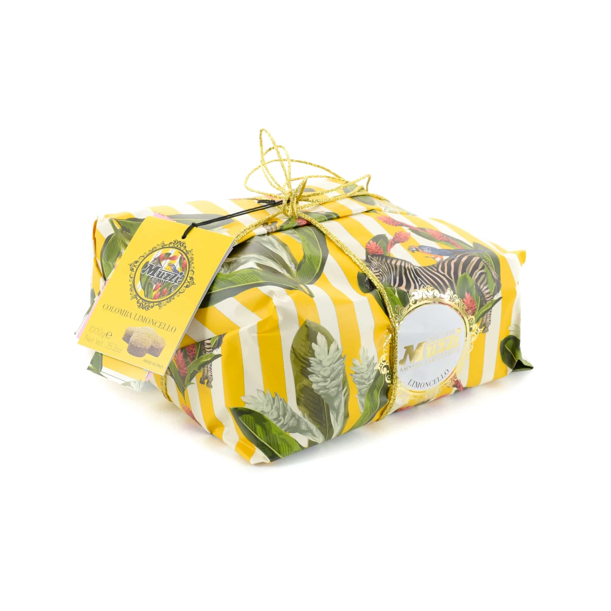 Muzzi’s limoncello colomba is filled with sweet limoncello cream, candied lemon peel, and pieces of plain chocolate – all nestled in a rich buttery, golden brioche-style dough. Enjoy this Easter colomba cake just as it is, served with an afternoon cup of tea or a morning coffee. The beautiful animal print wrapping also makes this a stylish Easter gift.