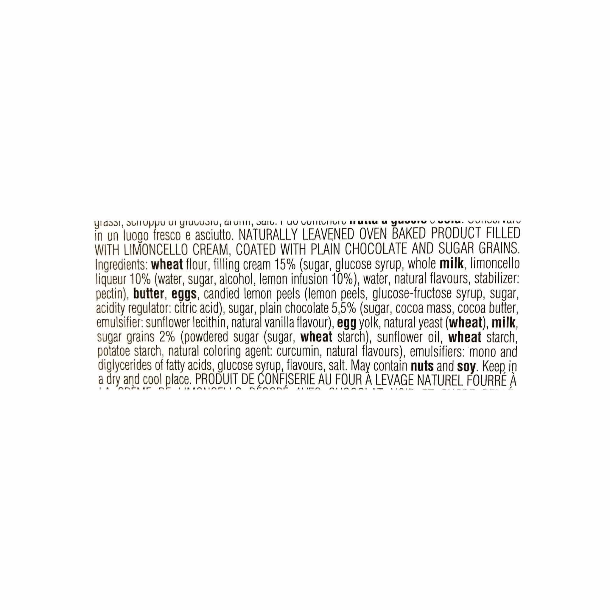 Ingredients: wheat flour, filling cream 15% (sugar, glucose syrup, whole milk, limoncello liqueur 10% (water, sugar, alcohol, lemon infusion 10%), water, natural flavours, stabiliser: pectin), butter, eggs, candied lemon peels (lemon peels, glucose-fructose syrup, sugar, acidity regulator: citric acid), sugar, plain chocolate 5.5% (sugar, cocoa mass, cocoa butter, emulsifier: sunflower lecithin, natural vanilla flavour), egg yolk, natural yeast (wheat), milk, sugar grains 2% (powdered sugar (sugar, wheat starch), sunflower oil, wheat starch, potato starch, natural colouring agent: curcumin, natural flavours), emulsifiers: mono and diglycerides of fatty acids, glucose syrup, flavours, salt.Â