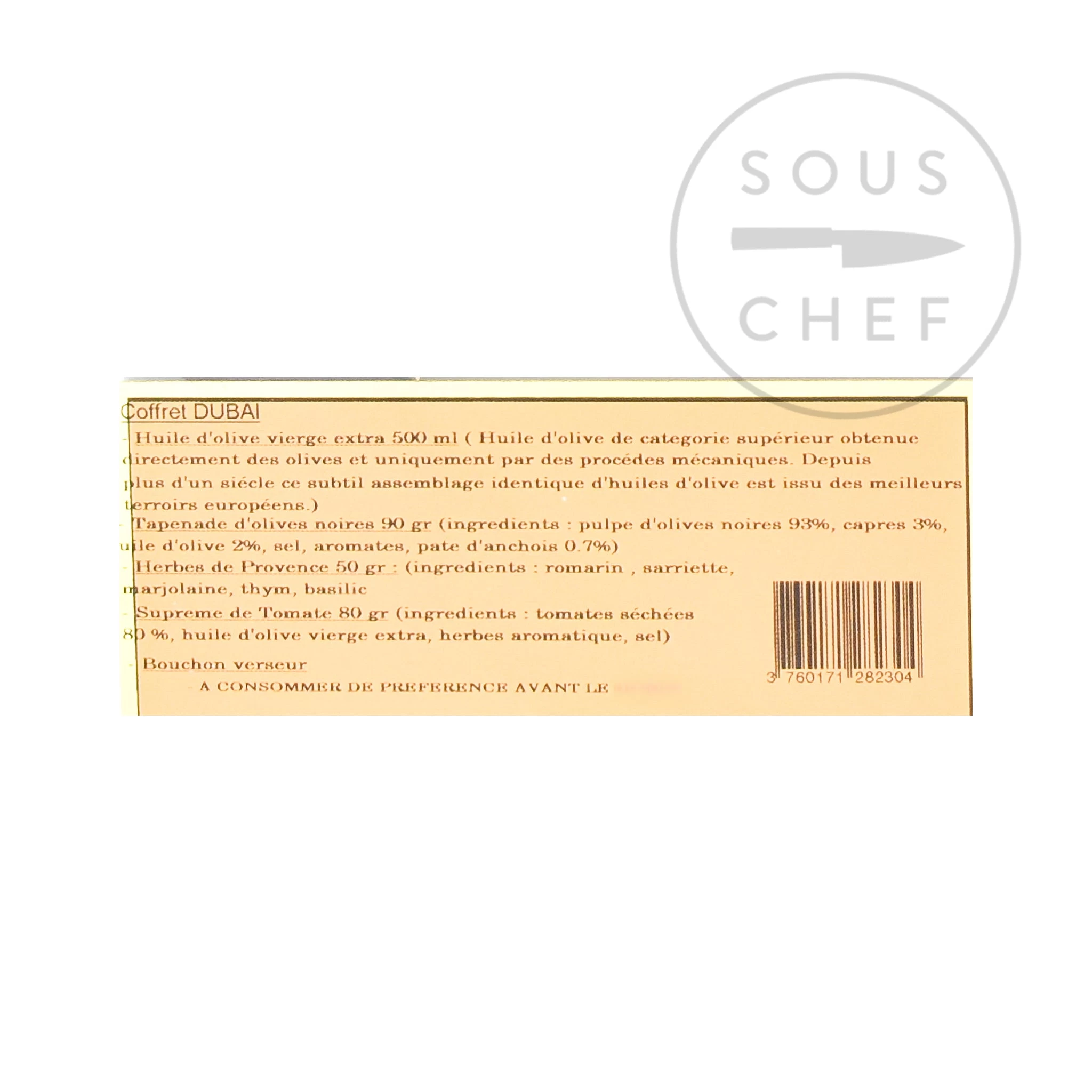 Ingredients: Extra virgin olive oil: extra virgin olive oil obtained by cold extraction. Black olive tapenade: black olive pulp (93%), capers (3%), olive oil (2%), salt, herbs & spices, anchovy (fish) paste (0.7%). Herbes de Provence: rosemary, savory, marjoram, thyme, basil. Dried tomato paste: dried tomatoes 80%, extra virgin olive oil, herbs, salt.