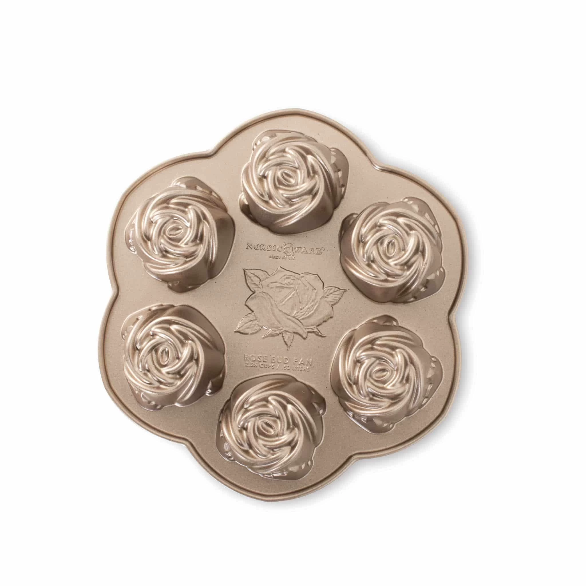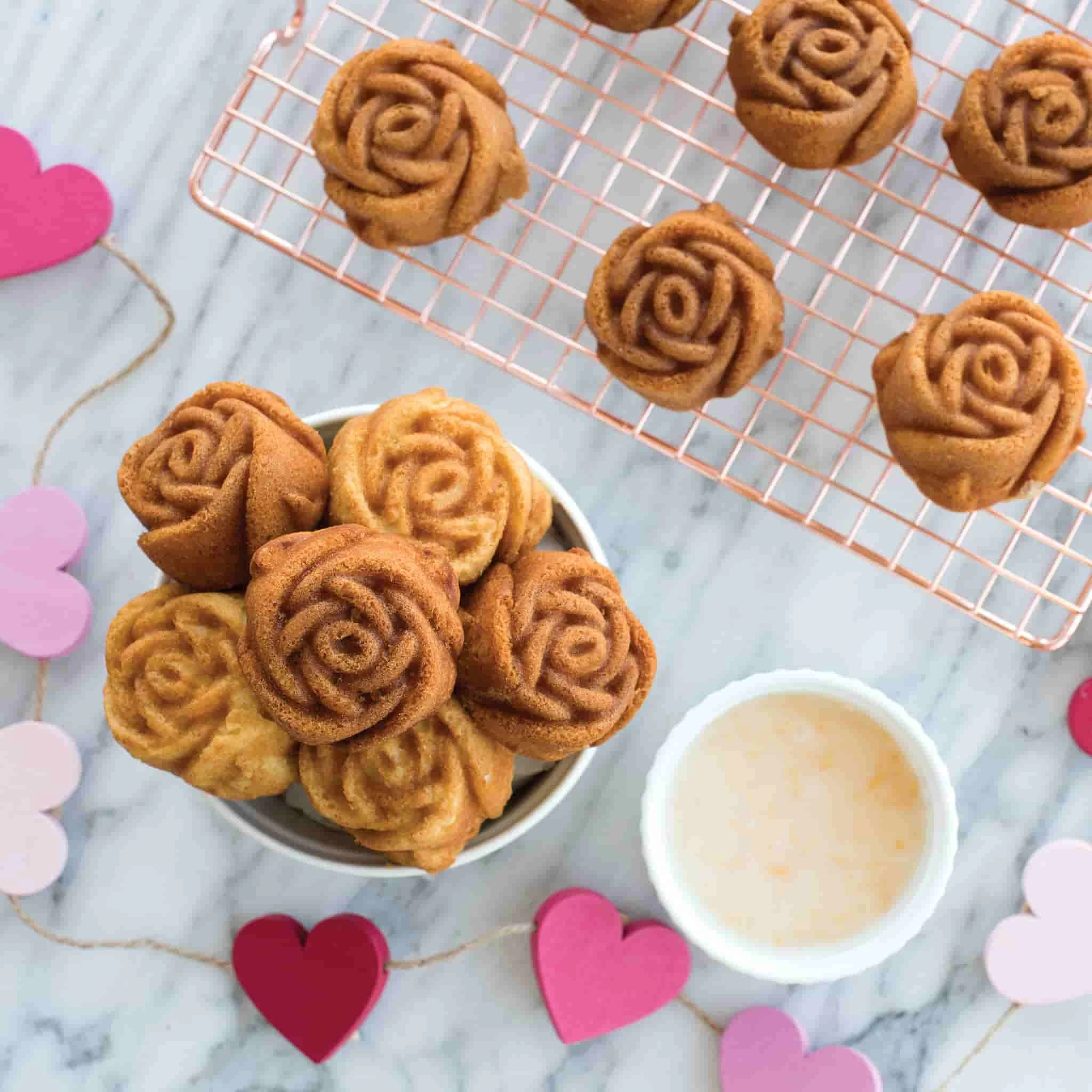 Use NordicWare rosebud cake pan to create individual, flower-shaped sponges. This toffee-coloured cast aluminium pan has a non-stick finish, making it easy to remove the cakes from the tin. The fine details within the pan create intricate cakes that look stunning without any decoration!Β