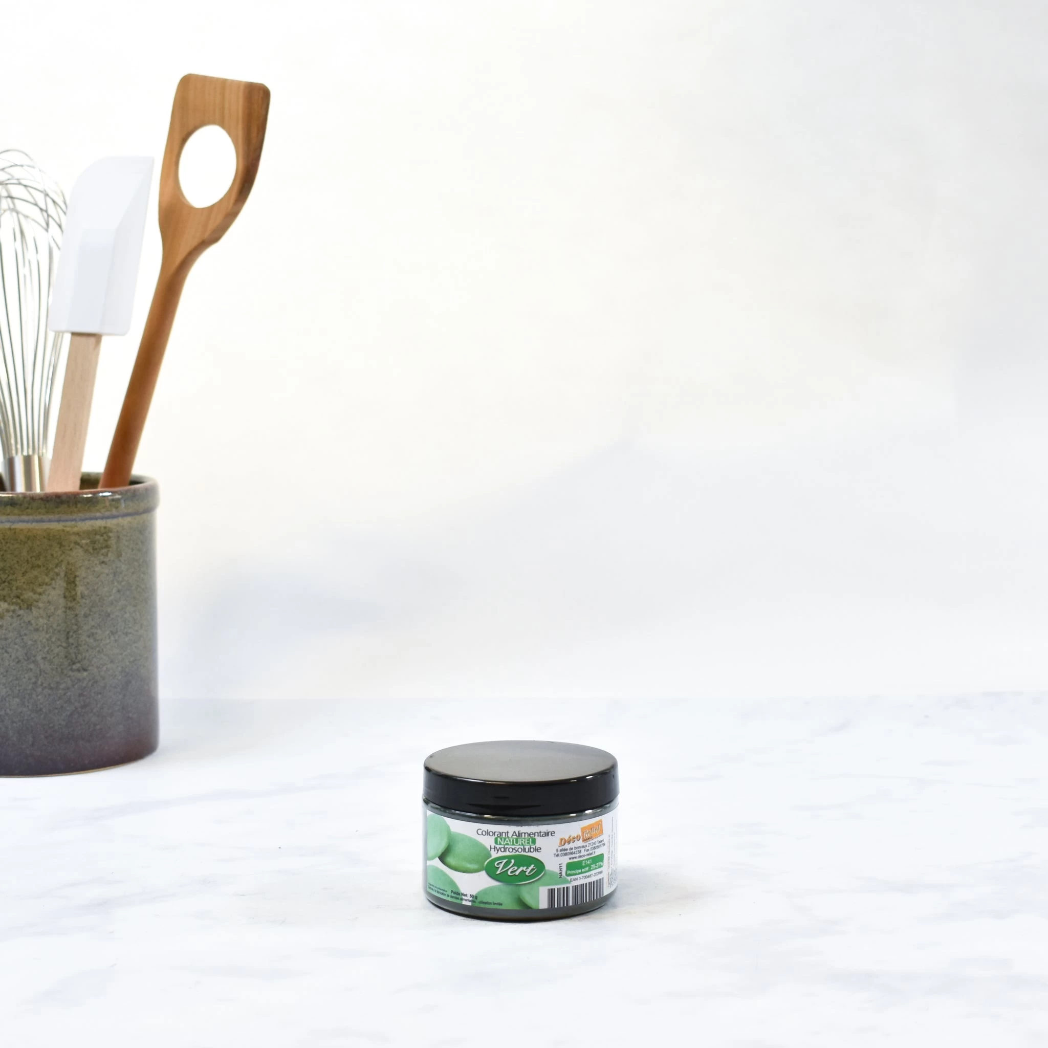 The natural green colouring is made from the natural chlorophyll found in plants and algae. Natural green food colour is perfect for colouring blamanges, macarons, meringues or even pasta dough. The natural green food colour can also be mixed with a little water, and used to paint patterns onto royal icing when decorating cakes.