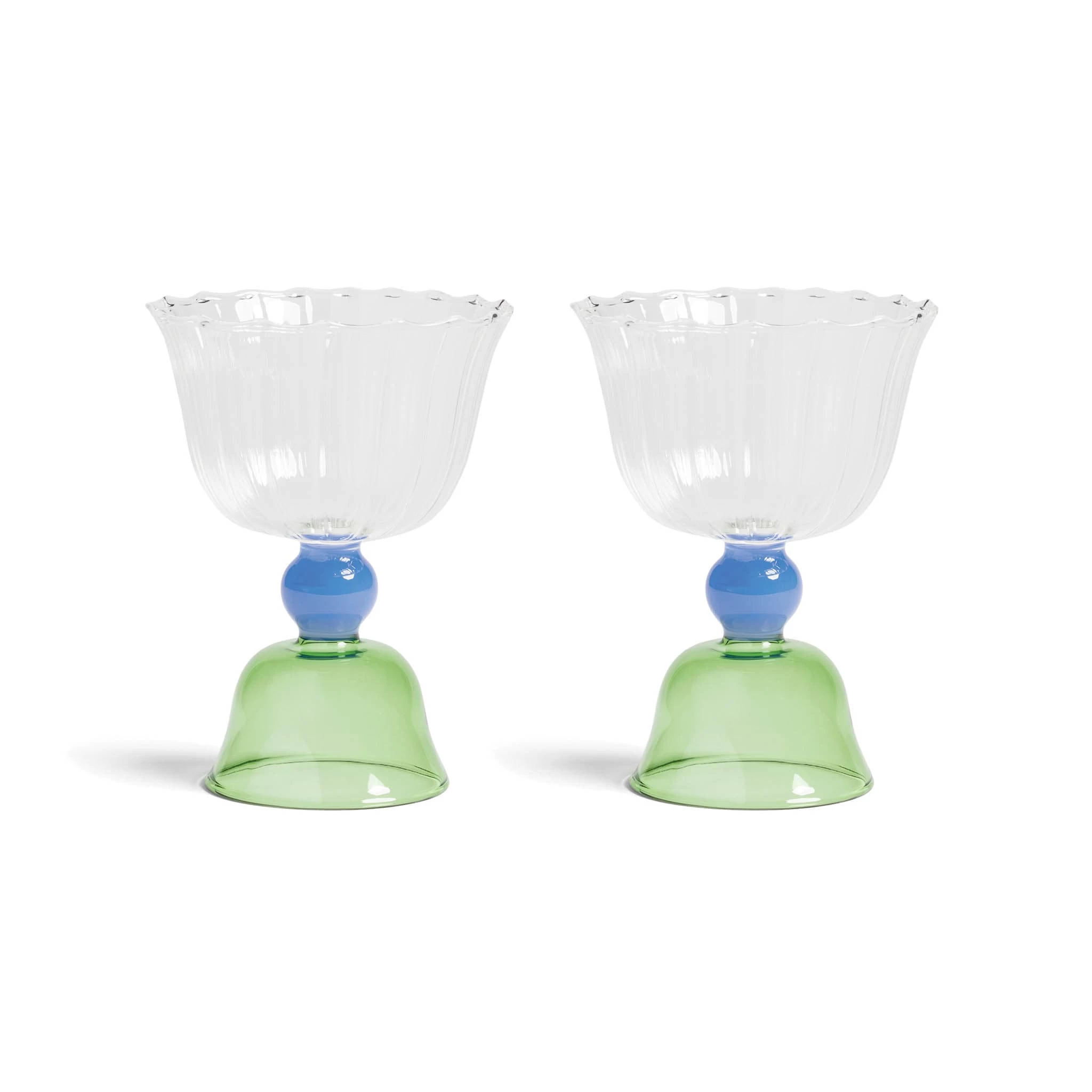 These green tulip coupe glasses will turn your next cocktail party into something extra special. They feature a fluted, tulip-shaped bowl perched on top of a round green stem and blue glass base. Elegant but understated, these glasses are ideal for wine, water or a round of zesty Margaritas.