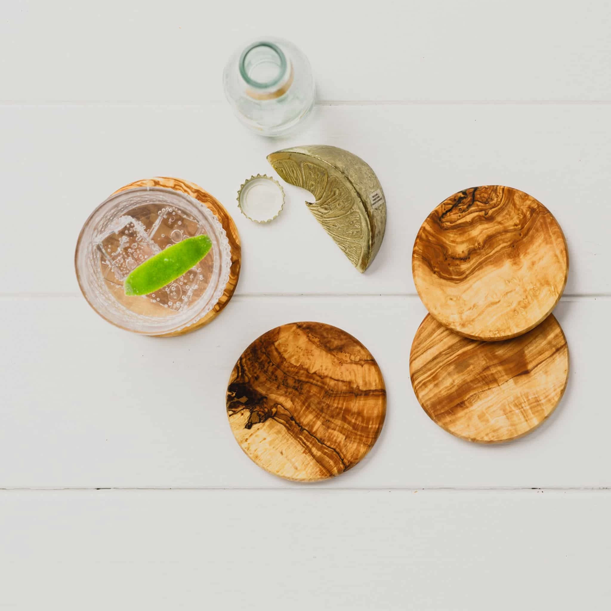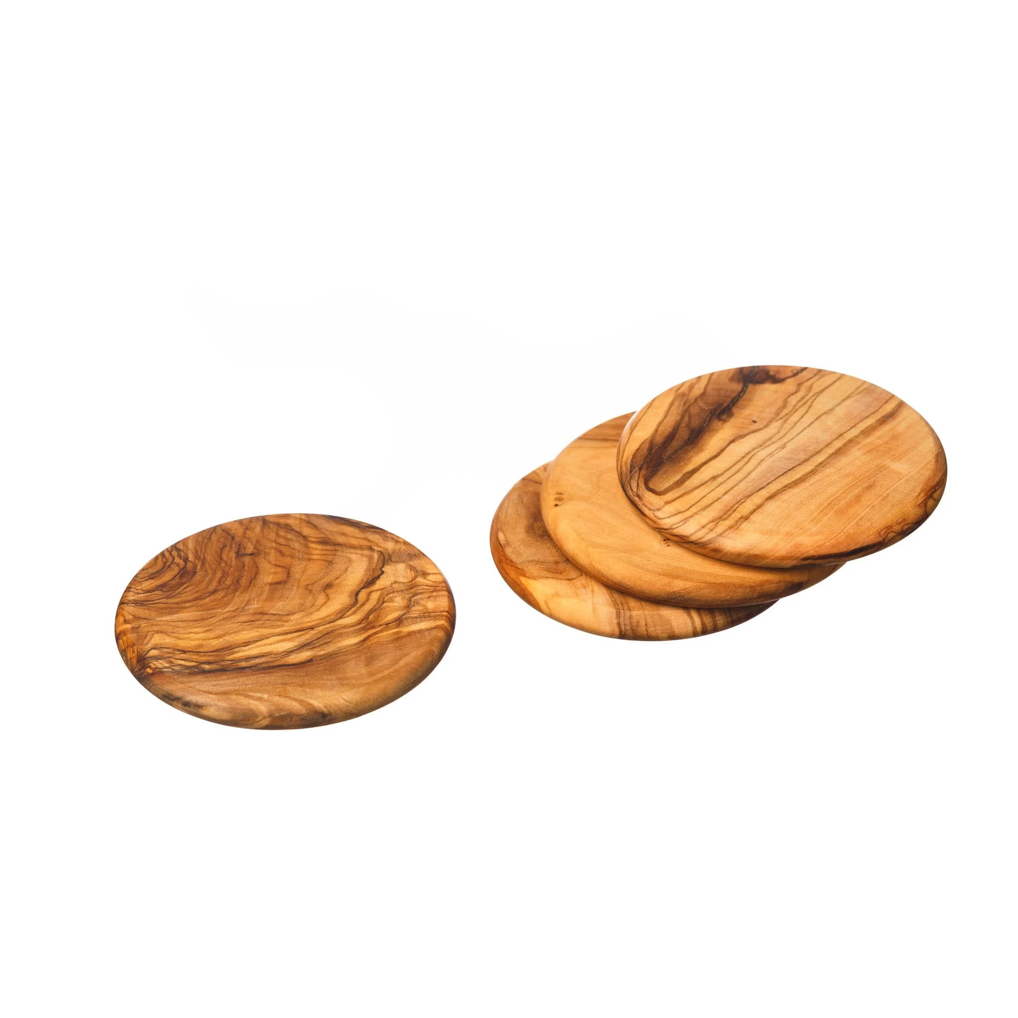 This set of 4 round olive wood coasters has a natural grain design in glowing golden brown tones for adding a rustic and stylish touch to your home.Â