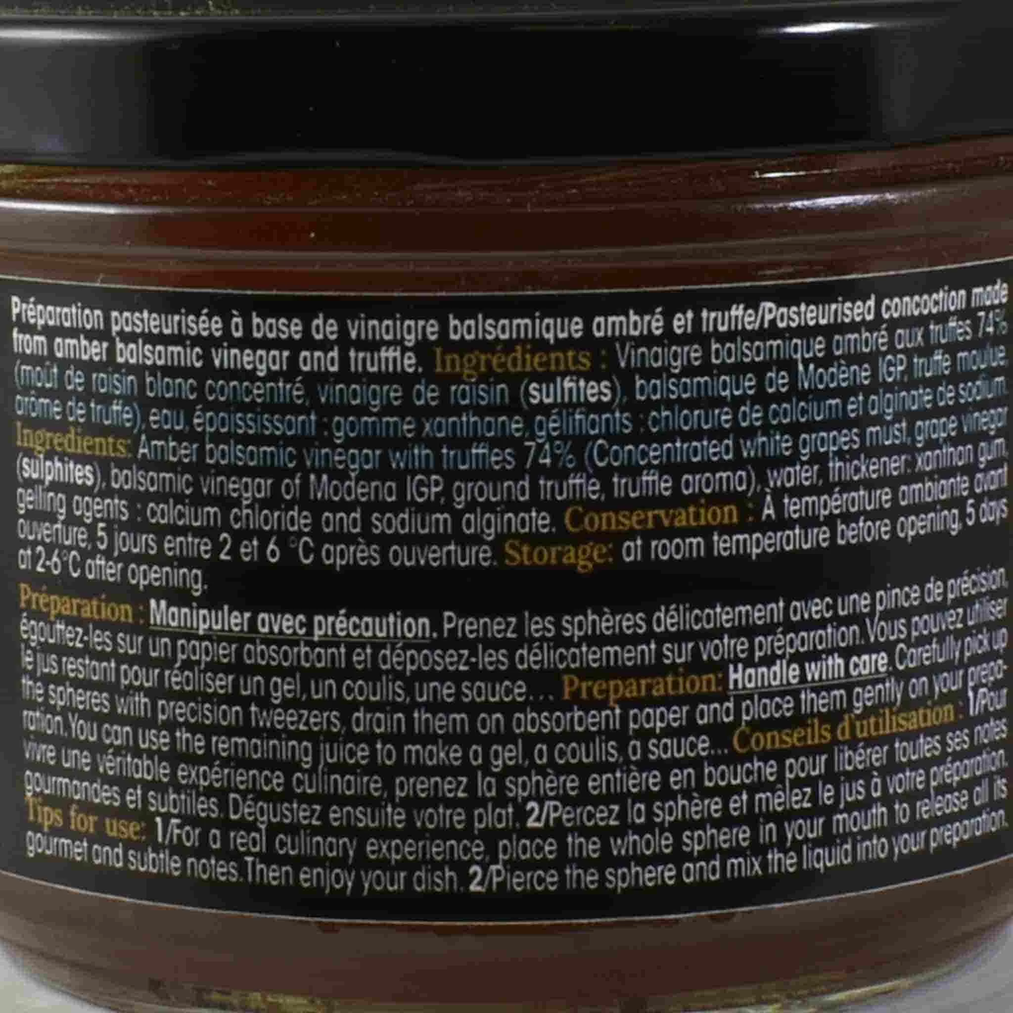 Ingredients: Amber balsamic vinegar with truffle 74% (Concentrated white grape must, grape vinegar, vinegar balsamic of Modena IGP, ground truffle 0.7%, truffle aroma 0.07%); water; thickener: xanthan gum; gelling agents: calcium chloride, sodium alginate.ย