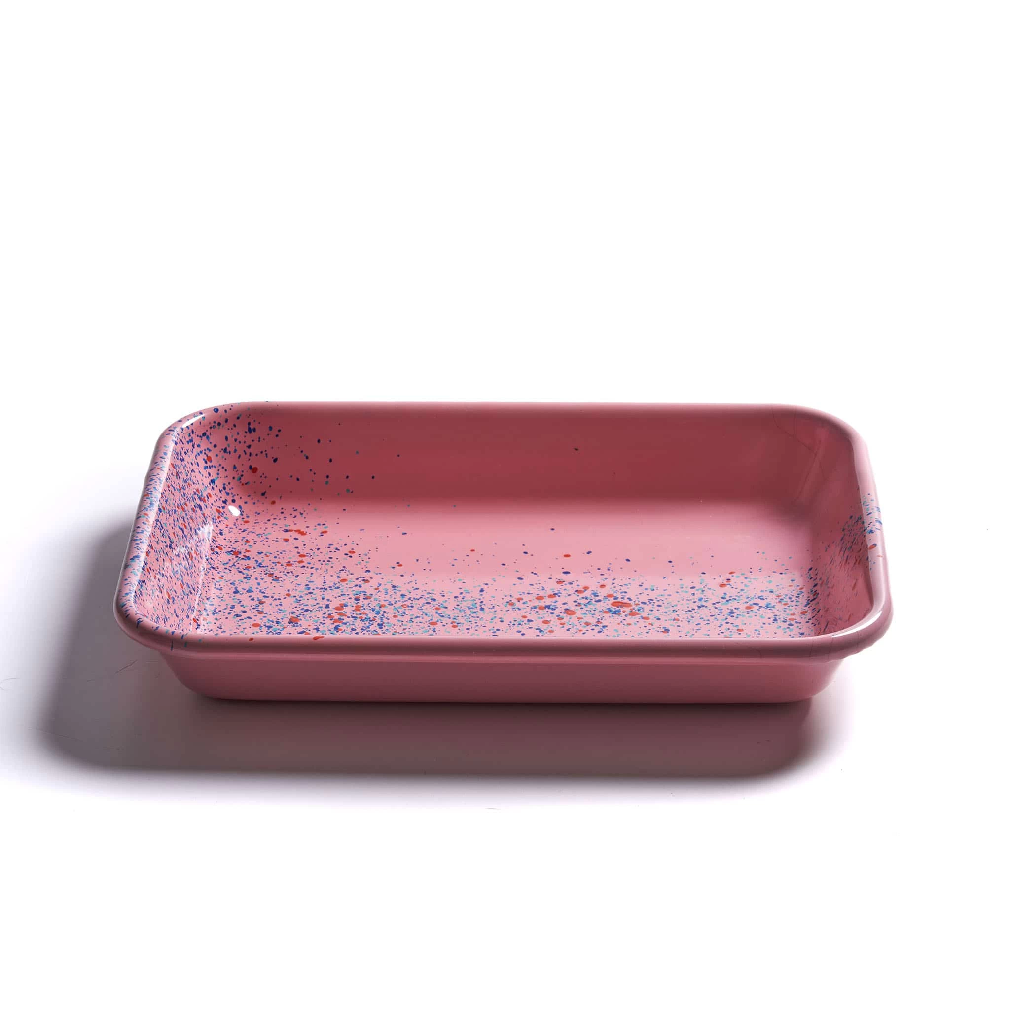 The Splatter Fest enamel roasting and serving dish in pink is a striking way to serve root vegetable gratins and truffled macaroni cheese. The pink dish is adorned with a splatter style design in shades of red, purple and teal blue. This incredibly versatile dish can be used in the oven and on the hob – serve from oven-to-table in style.Â